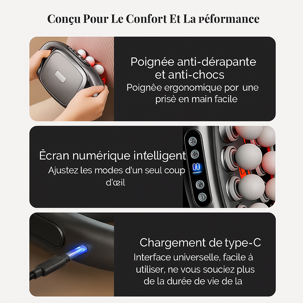 Sa conception à plusieurs têtes délivre des vibrations profondes et ciblées pour détendre les nœuds musculaires, stimuler la circulation et soulager les tensions de la tête aux pieds.